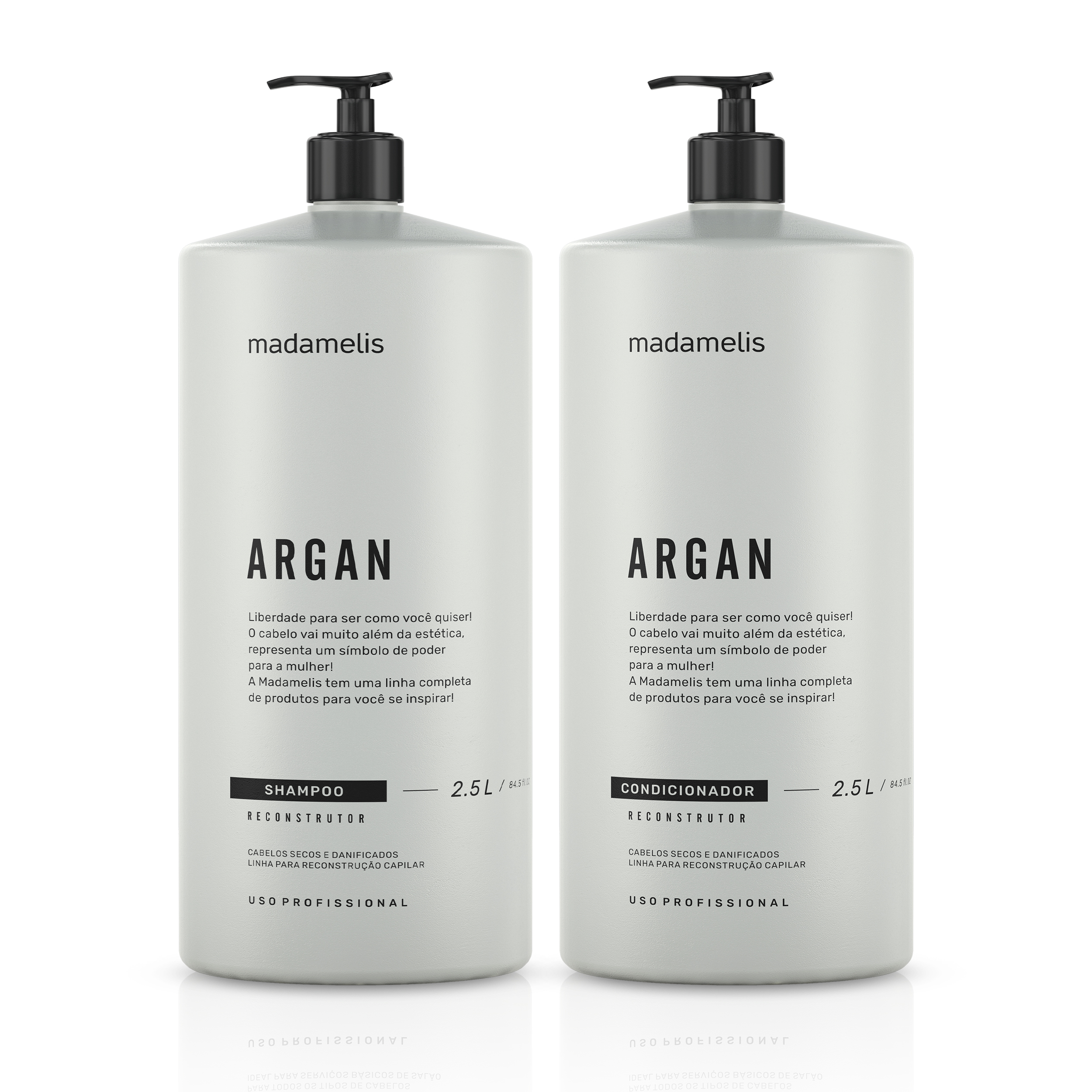 Visando atender às necessidades dos profissionais da beleza, a Madamelis apresenta uma linha exclusiva para lavatórios. Este kit contém shampoo e condicionador, ambos com 2,5 litros. A linha Argan se destaca no mercado pela sua qualidade excepcional e fórmula rica em ativos nobres. Com uma embalagem moderna e prática, é ideal para valorizar qualquer bancada de salão. Um tratamento completo para reconstrução capilar com resultado visível desde a primeira aplicação.